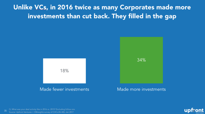Ve 2016'da 2015'e kıyasla iki kat daha fazla VC yatırımlarını geri çevirirken, piyasadaki boşluğu dolduran Kurumsal VC'ler (CVC'ler) için tam tersi oldu . Ve CVC'lerin %50'den fazlası 2017'de daha da fazla yatırım yapmayı planladıklarını söyledi.