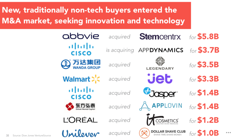 Şirketler son 18 ayda sadece risk sermayesi yatırımlarını hızlandırmakla kalmadılar, aynı zamanda başlangıç şirketlerini ve genellikle her zaman ilişkili olmayan şirketlerden satın almak için mega anlaşmaların hızını da artırdılar - Unilever gibi büyük teknoloji satın alımları 1 milyar dolara DollarShaveClub'ı satın aldı (LA'e gidin!) veya Walmart Jet'i 3 Milyar Dolara satın alır. Birleşme ve satın almanın daha fazla girişim yatırımı getirdiğini hepimiz biliyoruz.