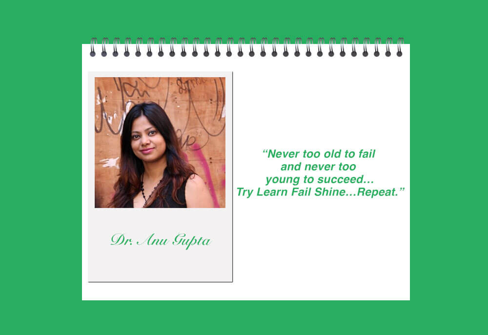 Anu 博士敦促女性通过调用她们内心的“Devi”来实现自我实现,意思是“发光”(词根“div”)。 她向所有人传达的信息是“永远不要太老而不能失败,永远不要太年轻而不能成功……尝试学习失败闪耀……重复”。