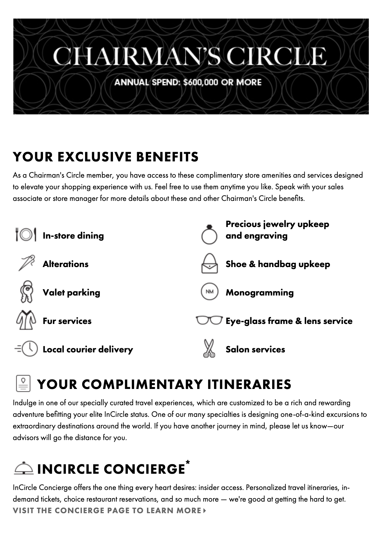 继续往上走,从最高级别的名称到提供的奖励,Neiman Marcus 的主席圈是奢华、独家和体验奖励相遇的完美例子。 对于初学者来说,客户每年需要花费 600,000 美元才能达到这一水平,从而实现这一令人垂涎的地位本身就是一种回报。