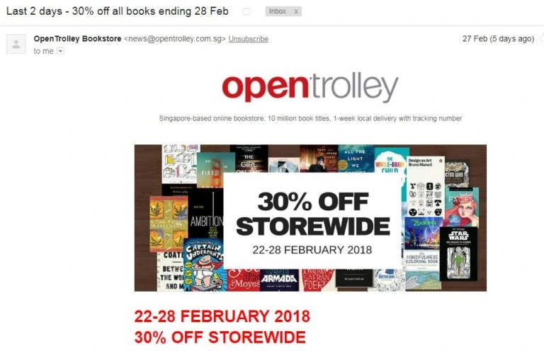 稀缺性也最适合电子邮件营销。 您可以向订阅者发送限时或库存相关的折扣和优惠。 这是一个来自在线书店 Open Trolley 的示例,它在全店范围内引发了稀缺感。