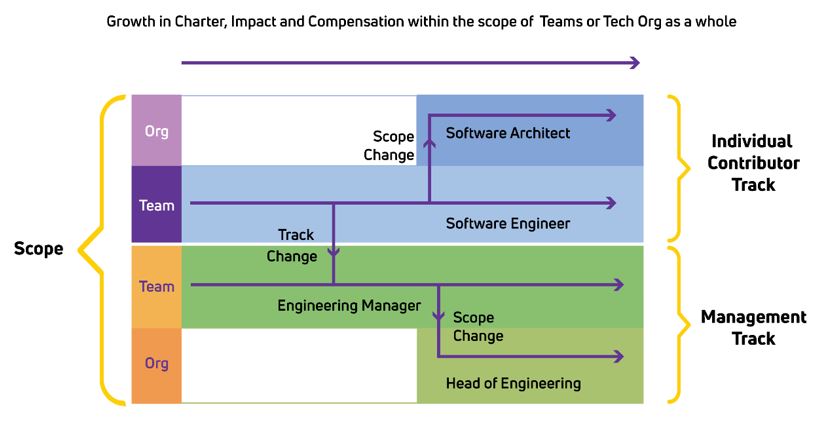 我们采用了与管理轨道类似的分支,以团队和组织范围作为职业发展的基础。 入门级工程经理以及具有团队范围的更有经验的工程经理被映射到工程经理的角色。 随着工程管理方面的章程扩大到包括非团队特定的组织责任以及损益责任的共同所有权,该角色变成了工程主管的角色。