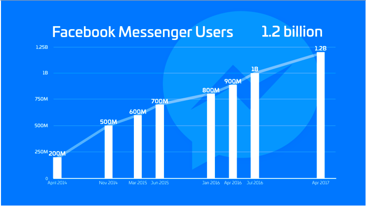 2017 年,Messenger 是数字营销人员讨论最多的话题之一。 根据 Facebook 的数据,2017 年 4 月 Messenger 应用的月访问量达到了 12 亿用户。现在,每月有大约 2000 万个页面交换消息,活跃的机器人数量已经达到 10 万。