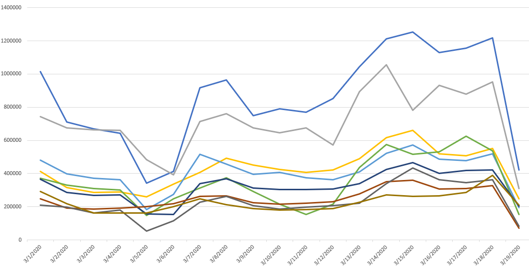 下图显示了Zeropark 数据,以及自 3 月初以来来自我们顶级流媒体源的流量如何飙升。 这就是为什么在线娱乐应该成为希望通过广告活动获利的联属营销人员的重点关注领域。
