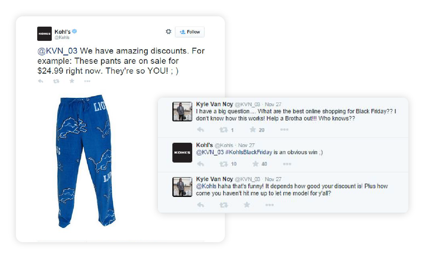 Kohl's 还使用社交聆听来监控和参与 Twitter 上的整个黑色星期五对话。 例如,当底特律雄狮队的线卫凯尔·范诺伊向他的追随者询问黑色星期五的最佳交易时,该品牌迅速介入,范诺伊也参与其中,让他的观众参与进来。