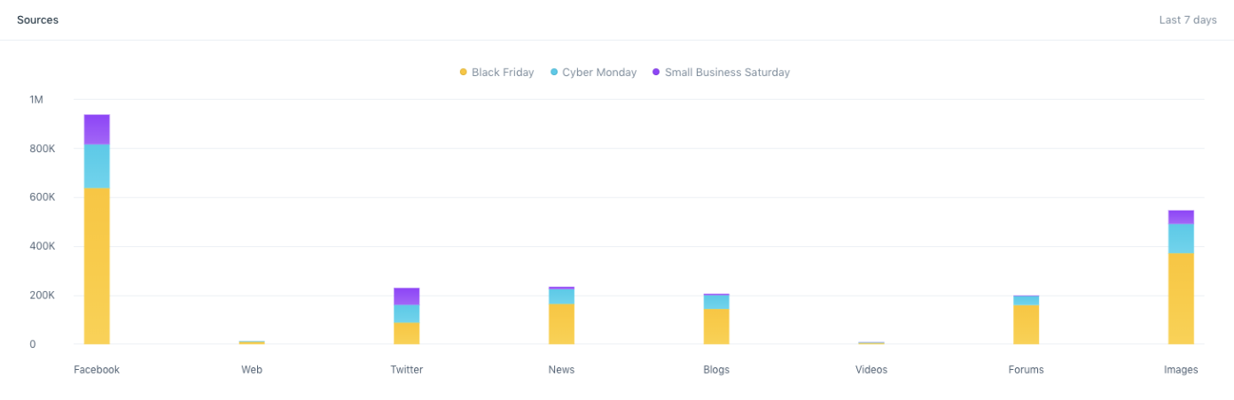 黑色星期五社交媒体是谈话失败的地方。 2017 年 11 月 24 日,“黑色星期五”的提及量大幅飙升,当天的“网络星期一”提及量超过 260,000 次。 Facebook 上的提及次数比其他任何平台都多。