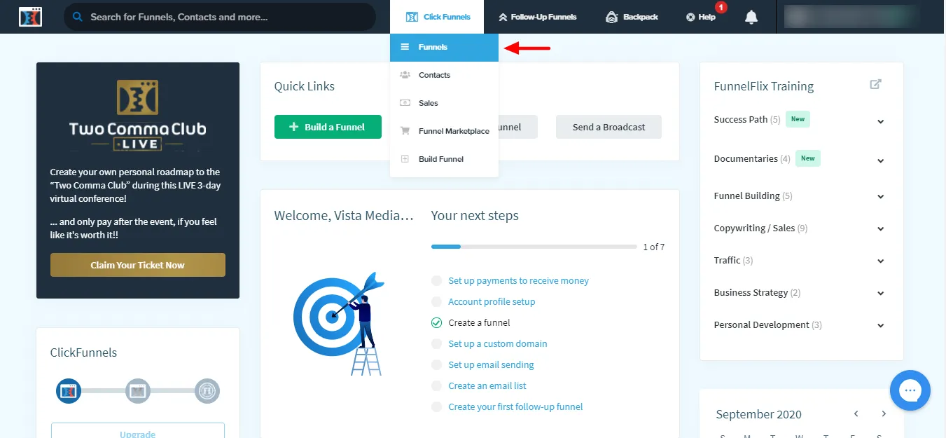 登录到您的 ClickFunnels 仪表板,导航到Click Funnels并单击Funnels (或Build a Funnel ,如果这是您的第一次):