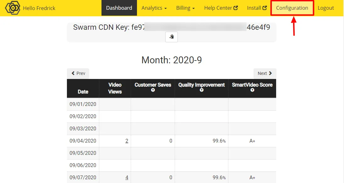 登录到您的 Swarmify 仪表板,然后单击配置,如下所示。