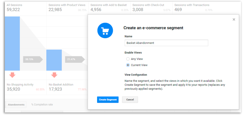 这个怎么做? 在同一个选项卡转化 > 电子商务 > 购物行为中,单击图表并创建要分析的认知细分。 例如,它可能是放弃购物篮的会话。