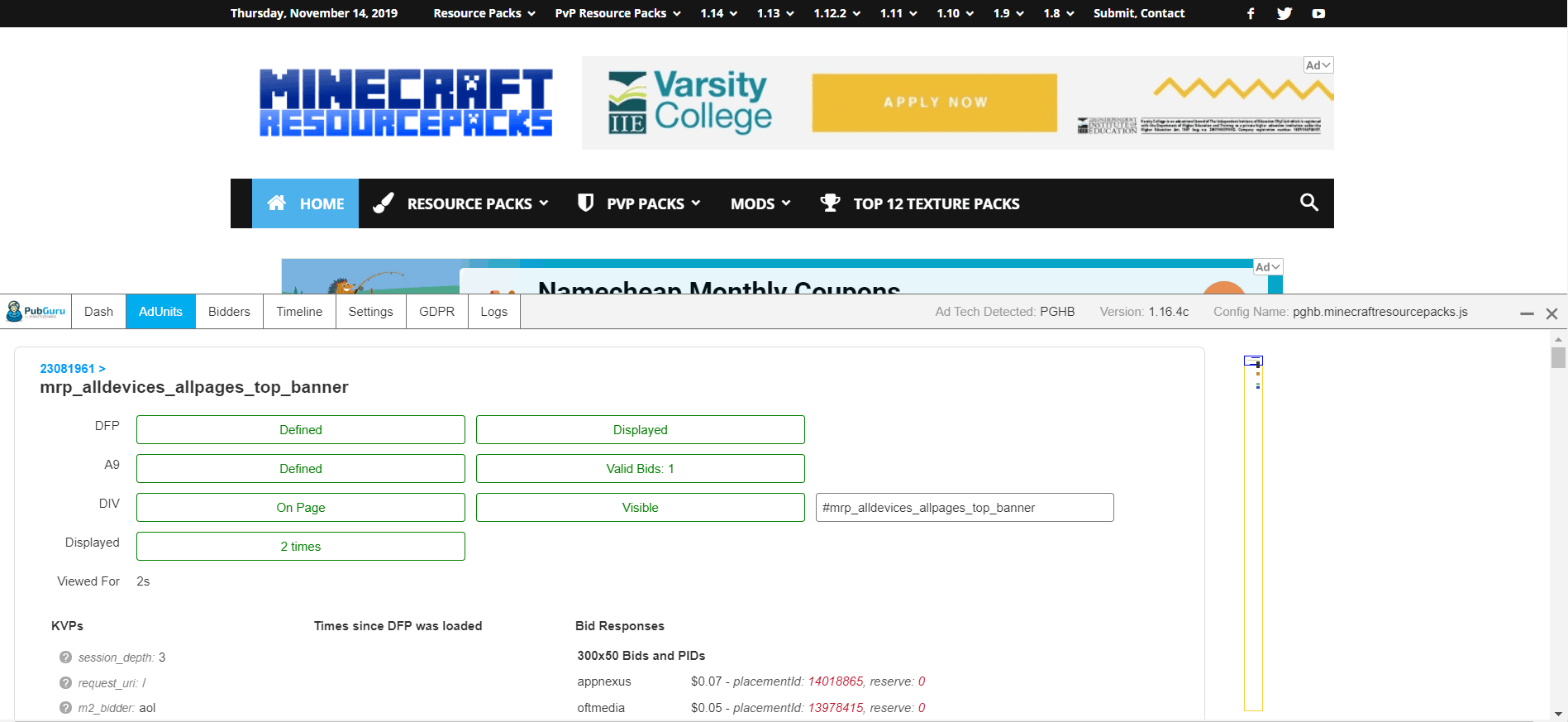 - 在这里,您可以查看投标人级别的情况、哪些投标人参与、响应时间、每千次展示费用和广告尺寸。