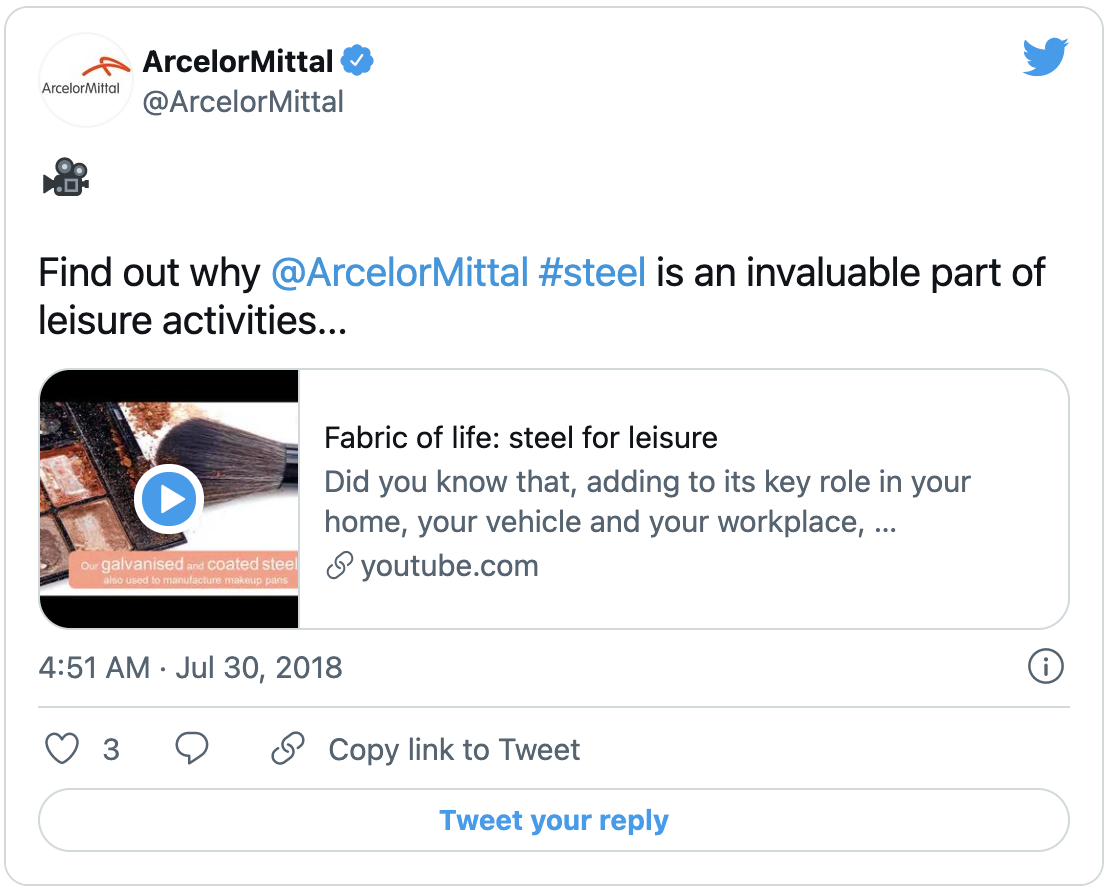 在 Twitter 上,该品牌展示了其材料的独特应用,并强调了制造安全的必要性。 它还定期转发公司国际部门的内容以及发布有关钢铁的推文的第三方账户。