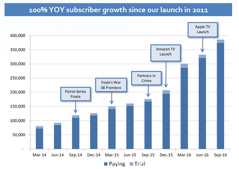 Acorns TV——美国订阅流媒体服务,以每月 5 美元的价格提供精选的英国利基内容(如 Poirot)——自 2011 年推出以来,用户同比增长 100%(见下文)