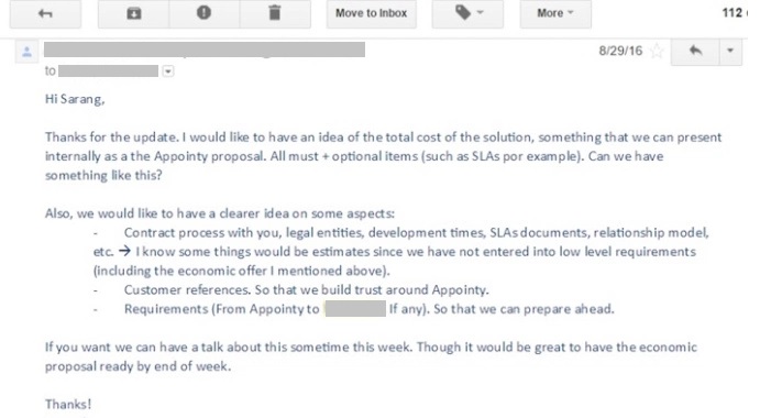 在此期间,我设法与牵头经理建立了良好的关系。 我们甚至已经从电话号码发展到了 WhatsApp/Skype。 在我们进行的无数次谈话中,我意识到他是我们内部的拥护者,他相信我们。