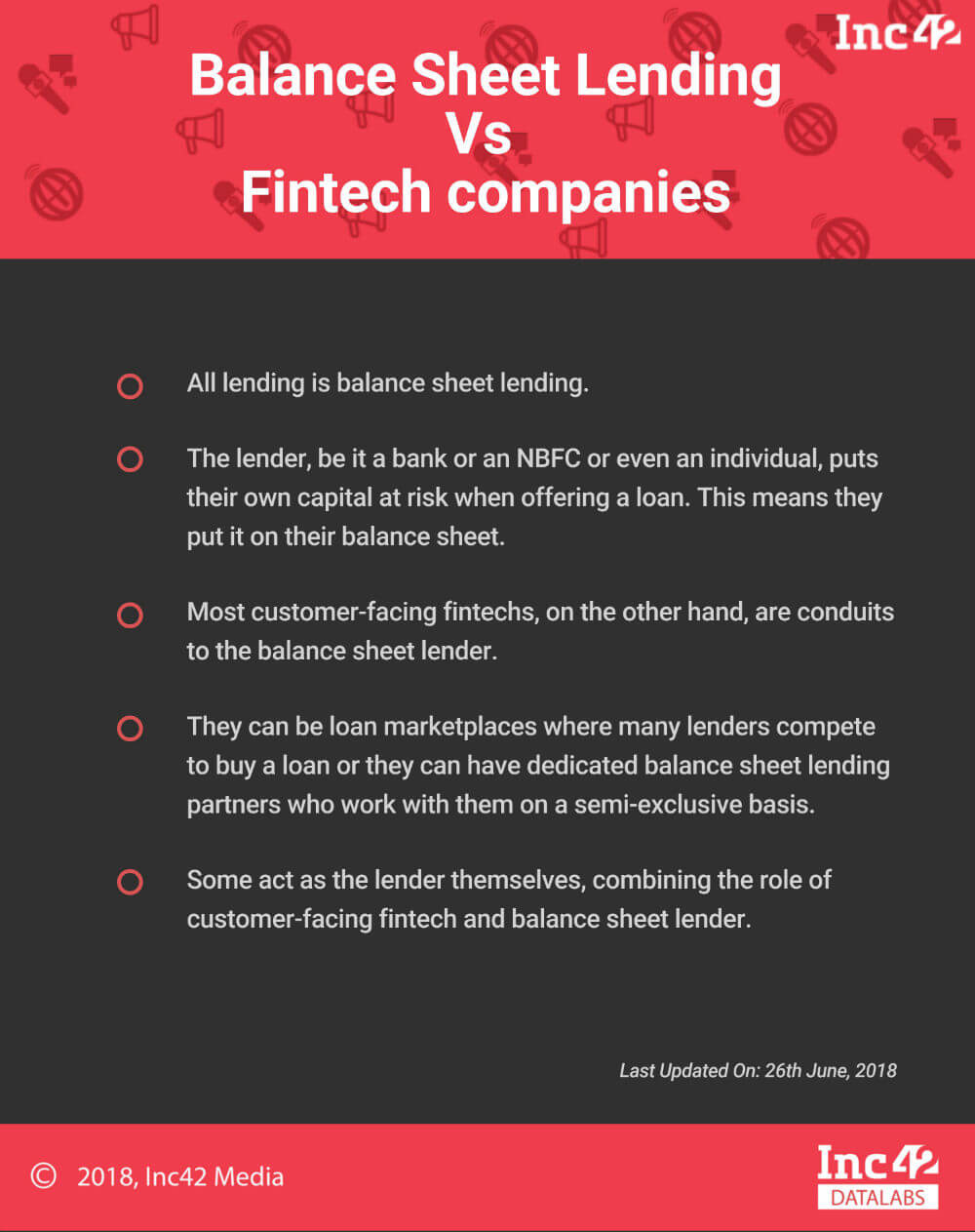 所有贷款都是资产负债表贷款。 贷方,无论是银行、NBFC 还是个人,在提供贷款时都会将自己的资本置于风险之中。 这意味着他们将其放在资产负债表上。 另一方面,大多数面向客户的金融科技公司都是通往资产负债表贷方的渠道。 它们可以是许多贷方竞相购买贷款的贷款市场,也可以有专门的资产负债表贷款合作伙伴,以半排他的方式与他们合作。 有些人自己充当贷方,结合了面向客户的金融科技和资产负债表贷方的角色。