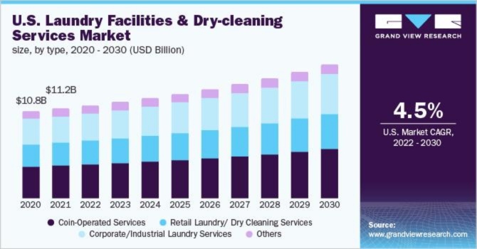 - 到 2022 年,洗衣行业市场价值将达到222.3 亿美元。 到2030 年,这一估值将增至1877.6 亿美元(预计)。2022 年至2030 年间,复合年增长率将达到30.6% 。