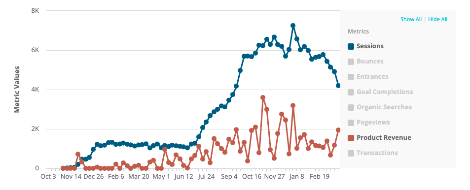 他们不仅看到了流量的大幅增加(深蓝色线),而且还看到了新的净收入(这意味着客户在访问操作方法文章后进行了购买):