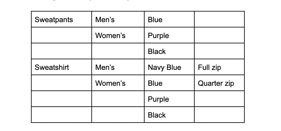 然后使用此表创建关键字/产品类别列表,例如“蓝色运动衫”、“四分之一拉链运动衫”、“女士蓝色运动裤”等。