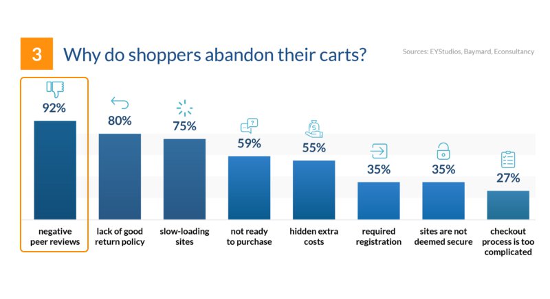 因此,如果您的评论并非普遍出色,请不要担心! 平衡的评论组合通常比压倒性的正面偏差更好。 只需确保进行评论管理,这样您就可以让您的客户乐于管理负面评论,因为它们是购物者放弃购物车的主要原因