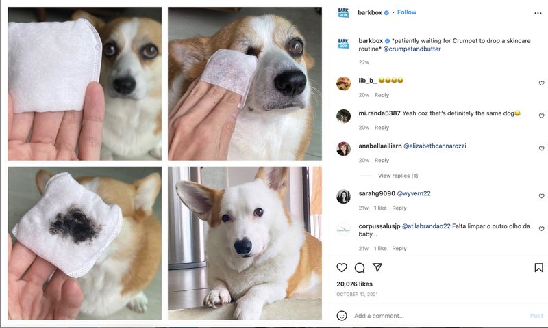 狗品牌 BarkBox 在 UGC 令人难以置信。 他们定期发布用户的照片、模因、视频等。 这不仅为他们提供了源源不断的精彩内容,而且随着用户将“他们的”BarkBox 帖子分享到他们自己的社交网站,它还提高了他们的有机覆盖面。