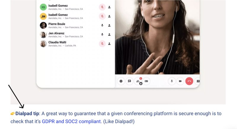 不要羞于炫耀您的企业已获得的认证或您符合的合规标准。 例如,在最近一篇关于免费视频会议工具的博文中,我们选择关注我们的 GDPR 和 SOC2 合规性: