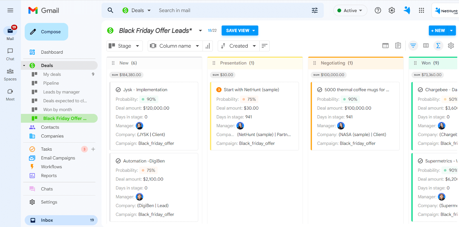 很明显,您应该使用能够将您的业务推向更高高度的 CRM 产品,而不是仅仅因为某个产品流行就使用它。 让我们看看 NetHunt CRM 如何帮助您做到这一点。