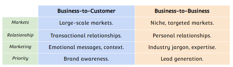 B2B 是从一个企业到另一个企业的商品、服务和信息交换。 我想指出它与 B2C 有多么不同,B2C 是企业和客户之间的商品和服务交换。 尽管是兄弟,只隔着一个字母,但您会惊讶地发现 B2B 和 B2C 有多么不同。 B2B 和 B2C 业务拥有不同的优先级。