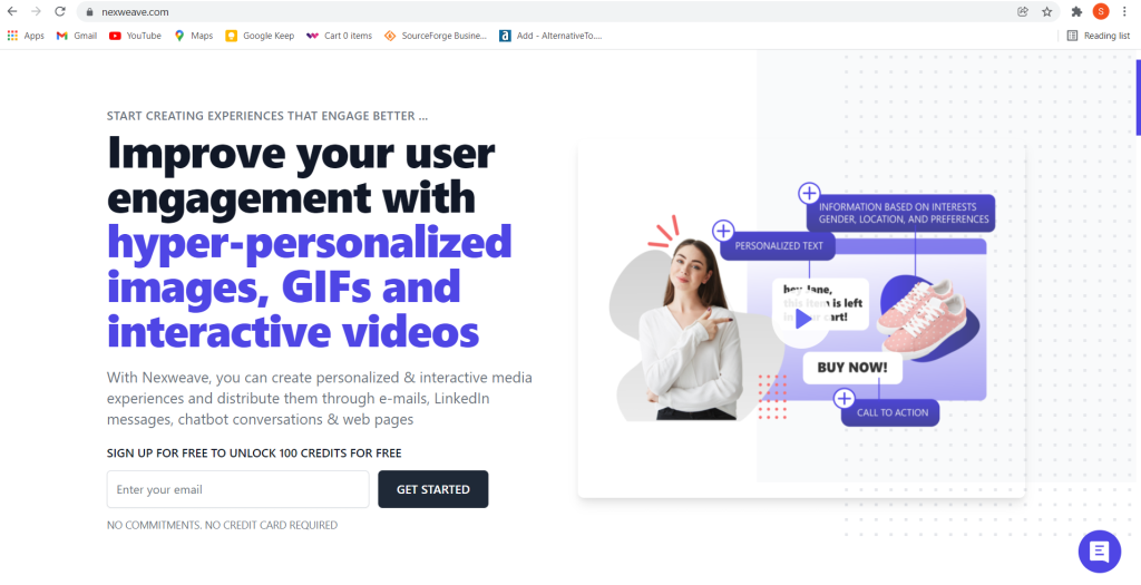 Nexweave 是一款功能强大的 SaaS,可帮助您创建超个性化的图像、交互式视频和 GIF,以显示在您的 LinkedIn 消息、电子邮件、登录页面和聊天机器人中。