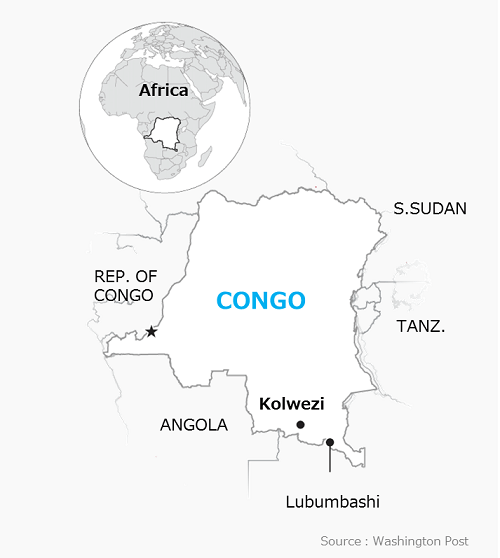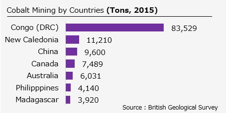 2015 年 DRC(刚果民主共和国)生产了大部分开采的钴,但中国是可用钴的最大生产国