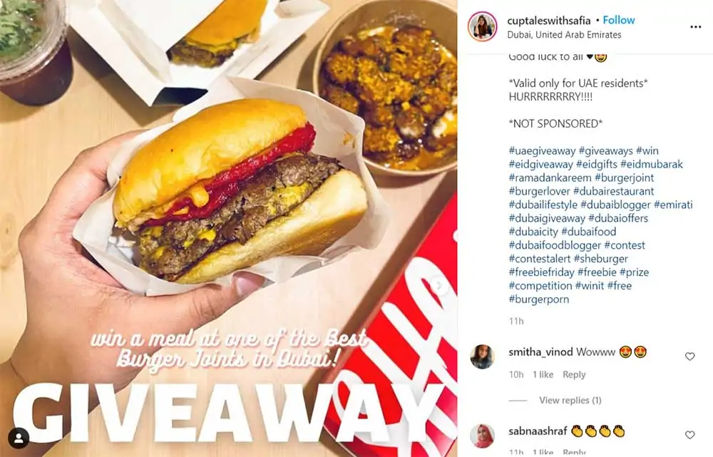 通過要求粉絲重新發布您的比賽並使用您的品牌標籤和本地標籤來增加分享。 在下面的 Instagram 贈品中,博主 Safia Mansoor Faiz 分享了與食物、比賽和地點相關的主題標籤。