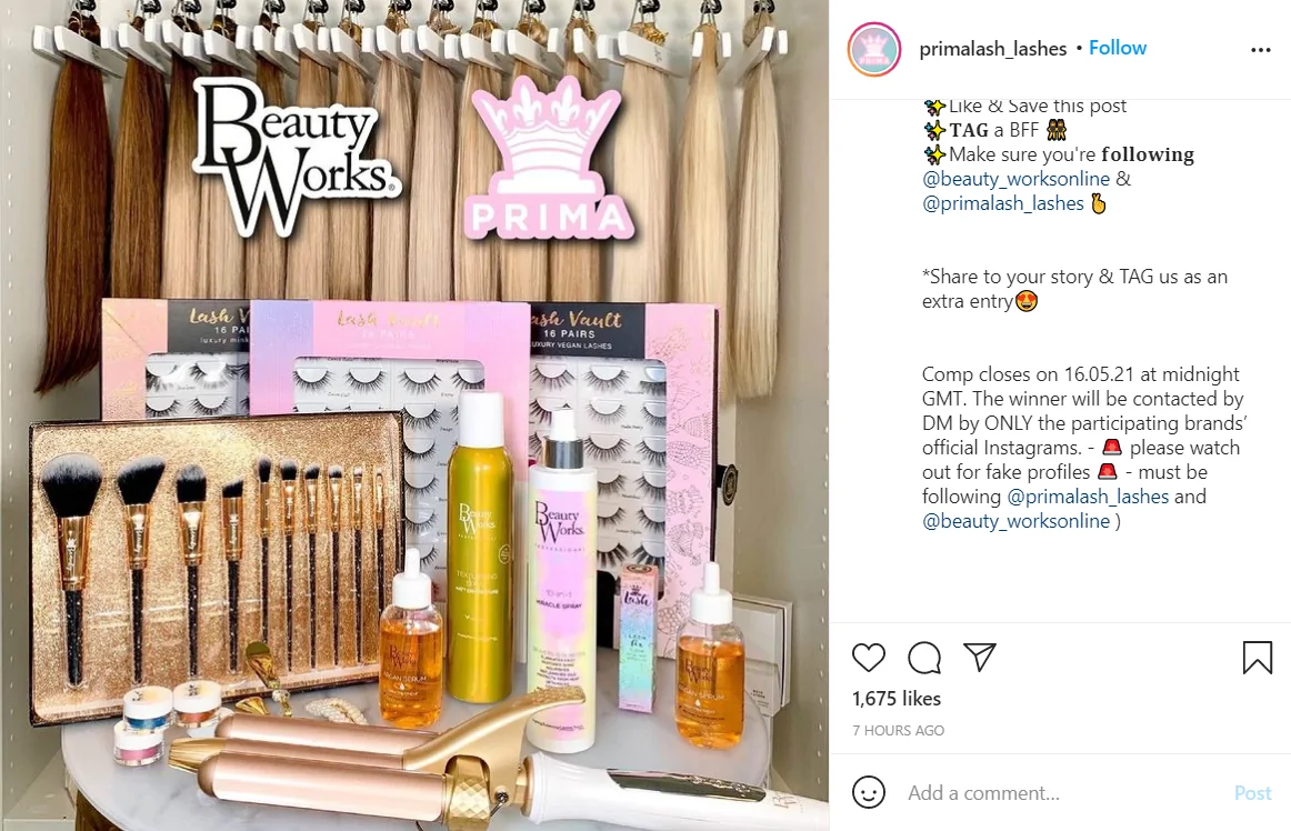 在下面的 Instagram 帖子示例中,PrimaLash 兩次提到參賽者必須關注兩個帳戶才能獲得參賽資格。