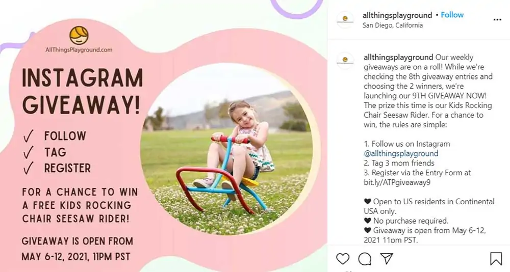 在以下示例中,All Things Playground 使用 Instagram 快拍引導觀眾了解贈品規則,他們會說:“向左滑動查看贈品包!”