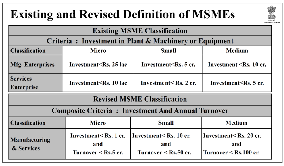 根據修訂後的定義,初創公司顯然是 MSME 領域的一個子集。 因此,符合“印度初創公司”定義的“初創公司”的企業將主要有資格成為中小微企業,並可以同樣獲得註冊。 需要註冊才能被視為 MSME。