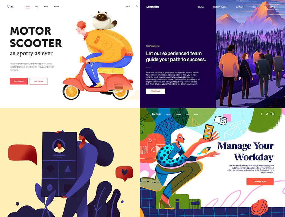 我認為這是對您的品牌最具說明性的代表,同時,執行起來也相當困難。 如果您仍在使用繁重的設計模式,則必須將此模式納入您的品牌。 當我說抽象插圖時,我的意思是不要使用無法舉例說明現實生活對象的特定比例和尺寸的圖紙,而是會顯示出一種奇異而古怪的外觀,並在其上產生夢幻般的效果。 但是,在某些情況下,您可能無法將這種特定形狀或模式用於您的業務模式。 這些插圖圖像已被各行業採用。 如果您正在經營一個科技行業,那麼您應該立即開始它。