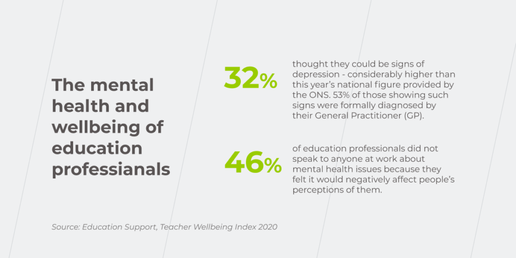 全職教師每週工作 51-57 小時,其中一半以上時間用於非教學活動。 難怪教育專業人士的抑鬱程度遠高於普通人群——分別為 32% 和 19%。 與此同時,幾乎一半的教師因為害怕被污名化而不會與工作中的任何人分享他們的心理健康問題。