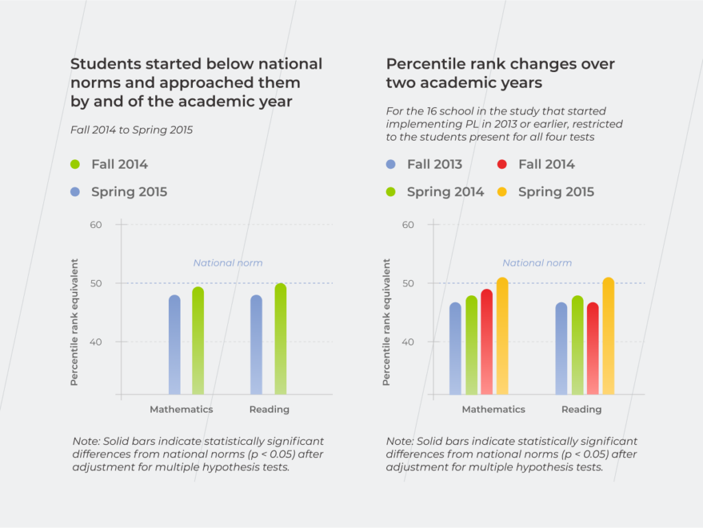由於教師能夠不斷跟踪每個學生的個人表現,他們可以根據學生所堅持的主題提供額外的材料和個性化的工作表。 蘭德研究表明,開始時低於國家標準,然後有機會在學習中利用個性化的學生在學年結束時達到了這些標準,並在兩年內超過了這些標準。