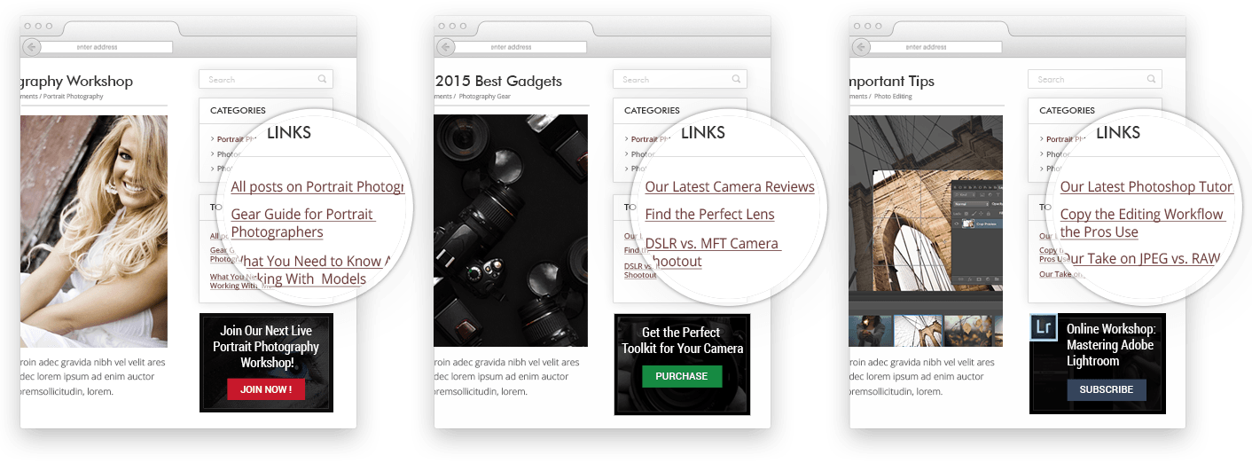 使用這個 Clever Widgets 插件,您可以輕鬆地在您的小部件區域中顯示高度相關的內容。 在這裡,我們在同一個網站上有三種不同的內容,帶有不同的橫幅和鏈接: