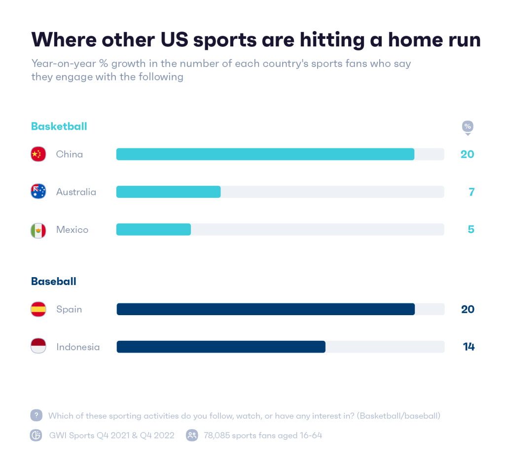 但美國在世界範圍內最受歡迎的運動是籃球。 在全球範圍內,籃球是第二受歡迎的運動,美國以外 39% 的體育迷表示他們觀看、參加或關注籃球運動。 事實上,在參與度方面,有 5 個國家領先於美國。