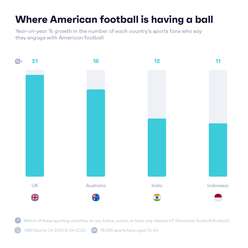 隨著越來越多來自澳大利亞、印度和印度尼西亞的體育迷收看 NFL,亞太地區對美式橄欖球的興趣也在上升。 隨著越來越多的澳大利亞人成為這項運動的傑出人物,澳大利亞人的興趣增長在該地區最為顯著。