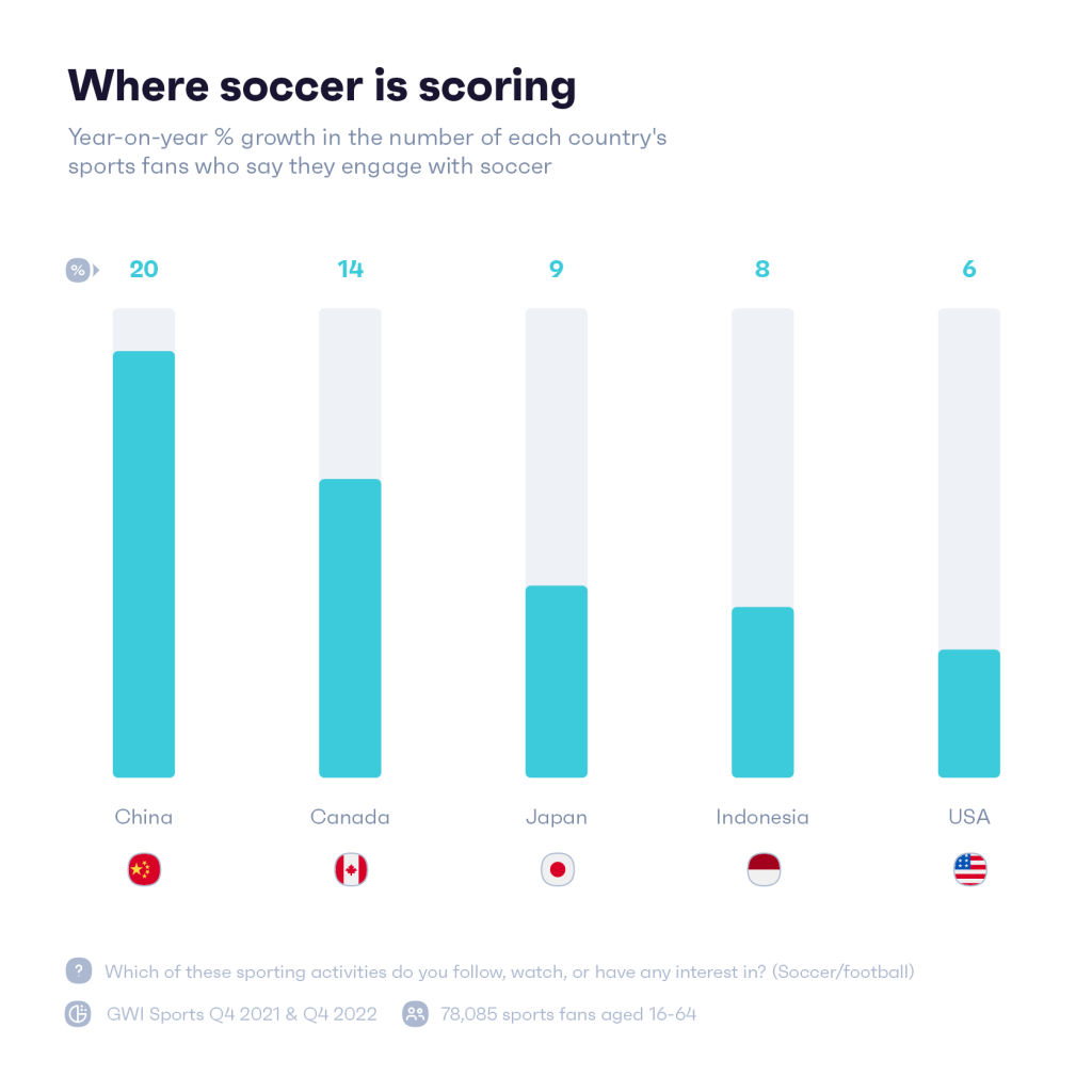 美國並不是足球運動發生重大變化的唯一國家。 最近,這項運動在中國受歡迎程度的增長可歸因於該國取消了零新冠政策,允許球迷重返體育場觀看新賽季的中超聯賽。 在加拿大,2022 年世界杯預選賽讓整個國家團結在一支球隊周圍,並在此過程中激勵了新一代球員。
