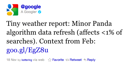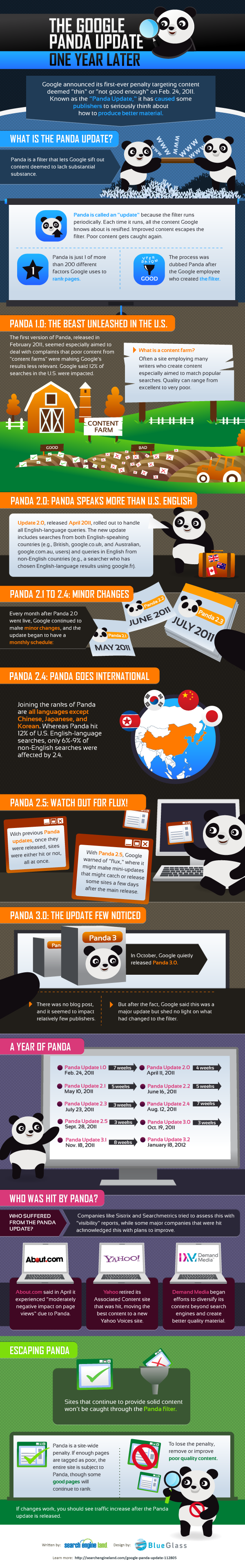 Panda 算法專注於通過審查頁面內容本身來從搜索中刪除低質量的內容。 該算法專注於內容稀少、以廣告為主的內容、質量差的內容(拼寫/語法錯誤)以及獎勵獨特的內容。 Google Panda 更新了 29 次,最終於 2016 年 1 月被納入核心算法。