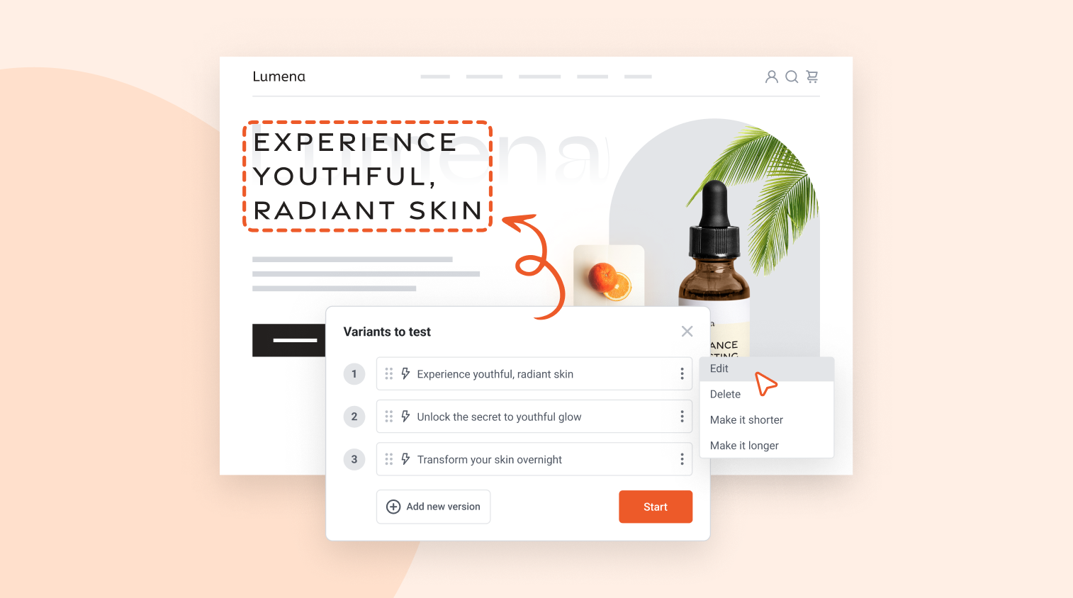 您所需要做的就是選擇要優化的元素,然後讓人工智慧為您的登陸頁面製作新的變體。 AI 將自動啟動、評估和停止 A/B 測試,直到找到獲勝版本。