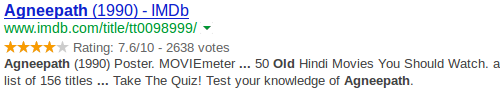 我們在這裡給出了兩個名為“Agneepath”的相同電影名稱的示例。 電影的信息由同一站點提供。 此處的豐富摘要顯示了投票數、評分數和星級。 該網站還對這兩部電影進行了簡短描述,這有助於我們區分兩者。