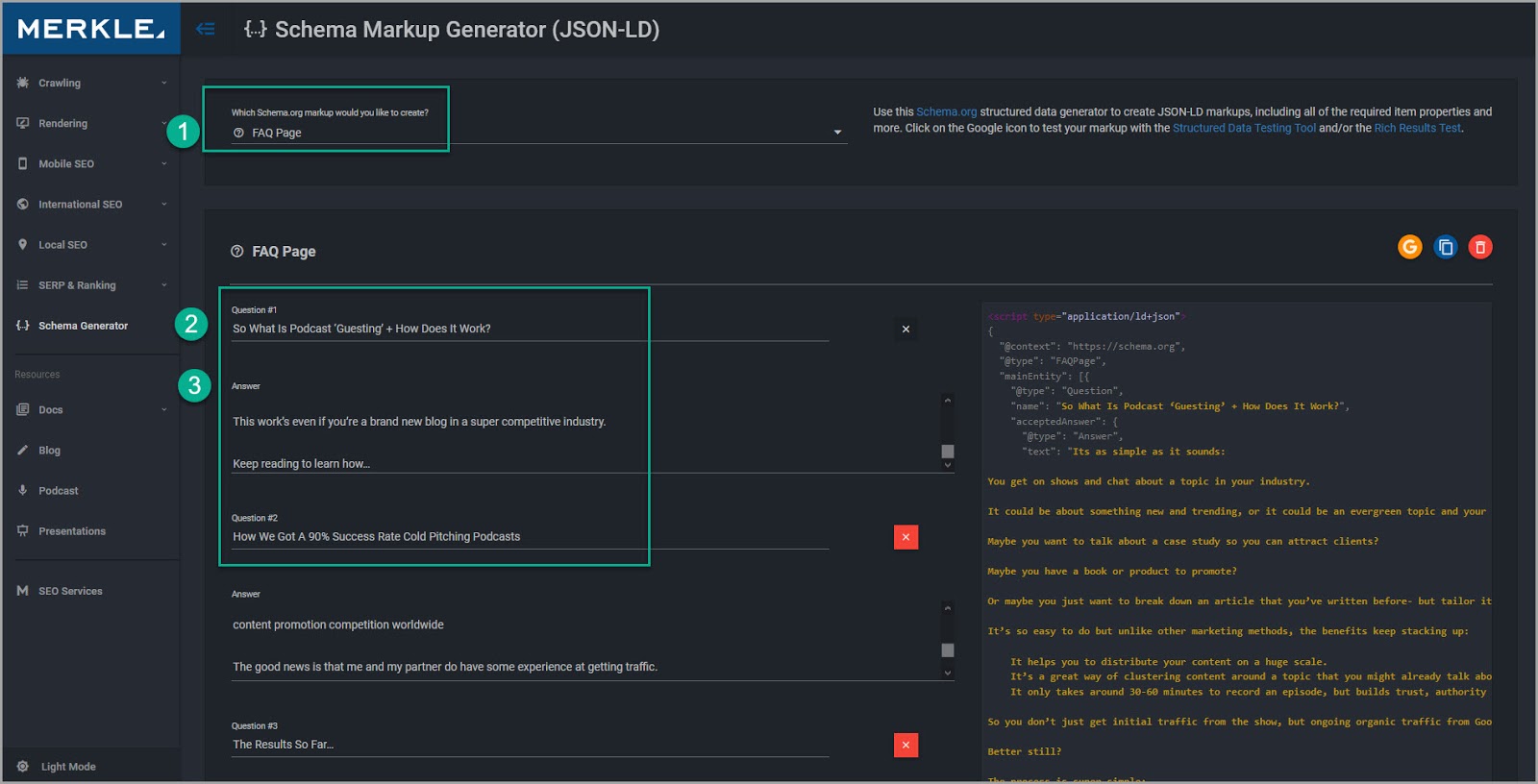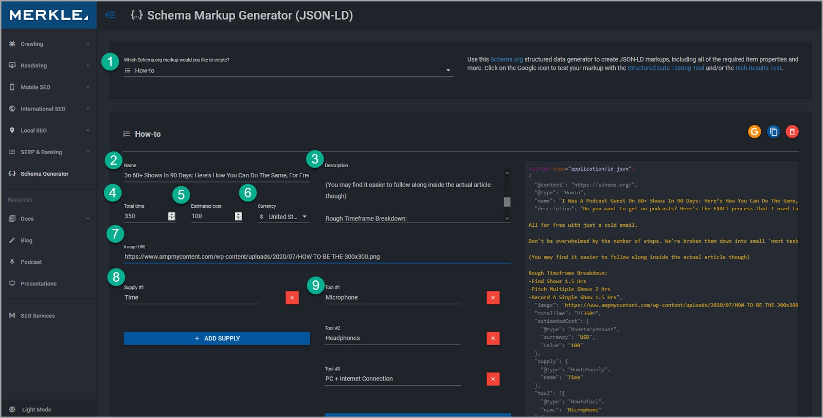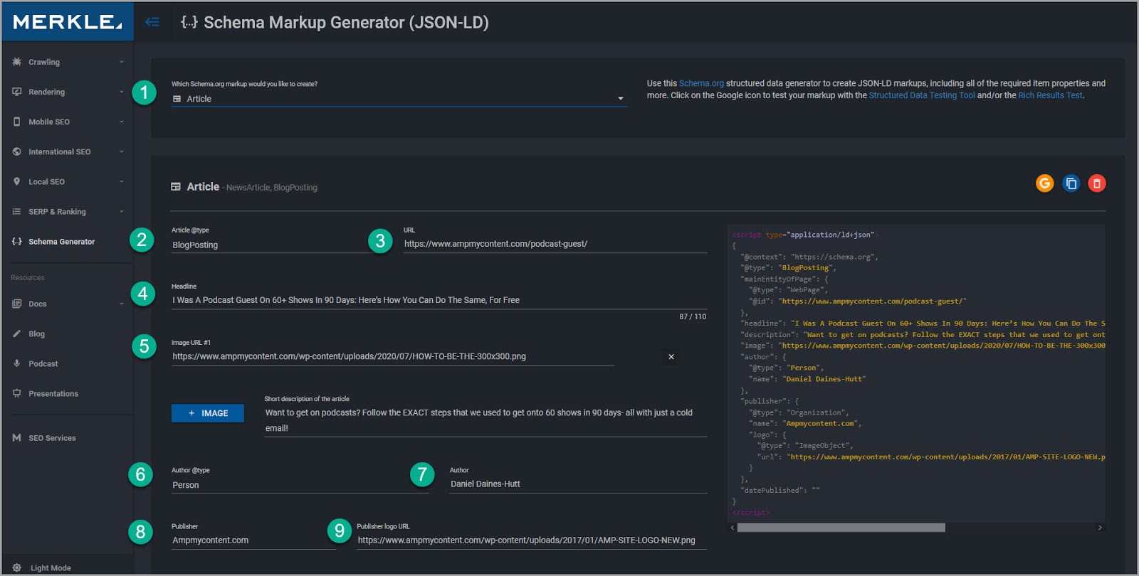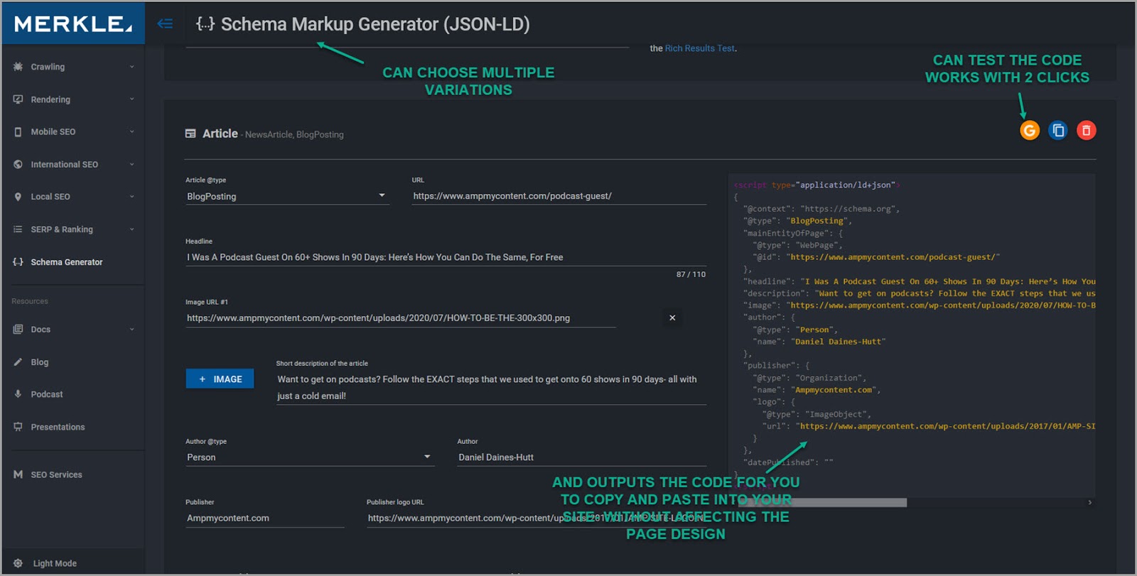 它不僅允許您輸入最多的 Schema 選項,而且輸出您需要的 JSON-LD 代碼,以便可以復制並粘貼到您的站點標題中。 這樣,當您將文章添加到頁面時,您不會影響文章的外觀。
