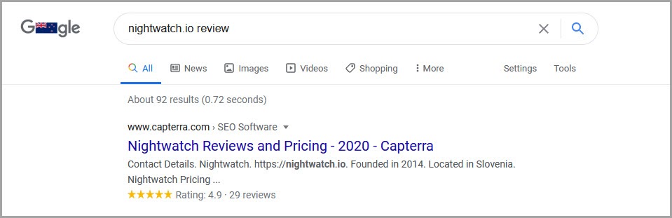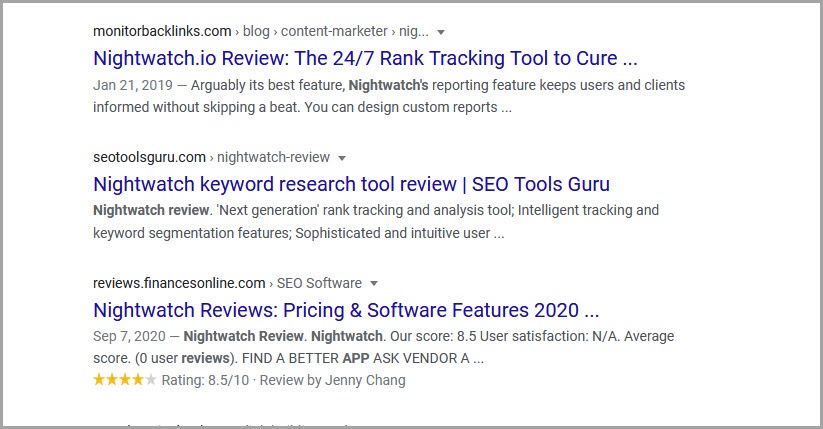 這些是顯示在頁面最頂部的“位置零”的結果。 他們經常分解一個主題,並比常規的搜索結果更詳細或提供更多信息。 在這裡你可以看到 Nightwatch 有 4.9 顆星,可以點擊進入直接用戶評論。