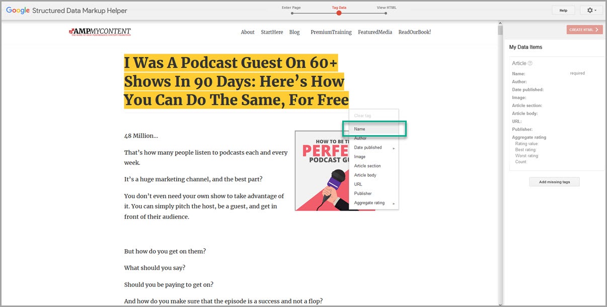 您只需加載頁面,突出顯示該部分,然後用相應的模式標記它。 就像我說的那樣,選項是有限的,您只能為可能具有多種潛在功能的文章添加一種核心類型。