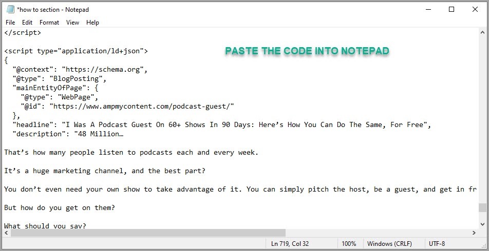 完成後,打開記事本並粘貼代碼,以便您可以在一秒鐘內使用它