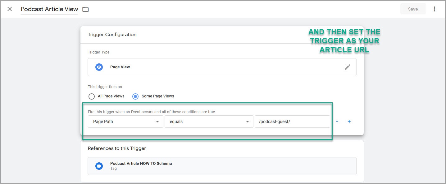 然後將觸發事件設置為路徑等於頁面的 URL slug 時。