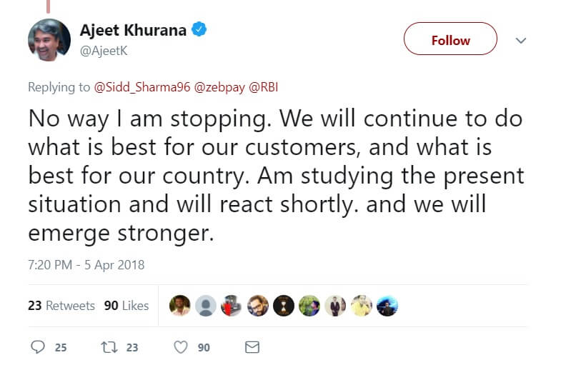 雖然Unocoin 的聯合創始人兼首席執行官 Sathvik Vishwanath告訴Inc42 ,“我們正在研究這個問題並研究如何處理這個問題,” Zebpay 的首席執行官 Ajeet Khurana 在推特上寫道,“我絕不會停下來。 我們將繼續做對我們的客戶最有利的事情,以及對我們國家最有利的事情。 正在研究目前的情況,很快就會做出反應,我們會變得更強大。”
