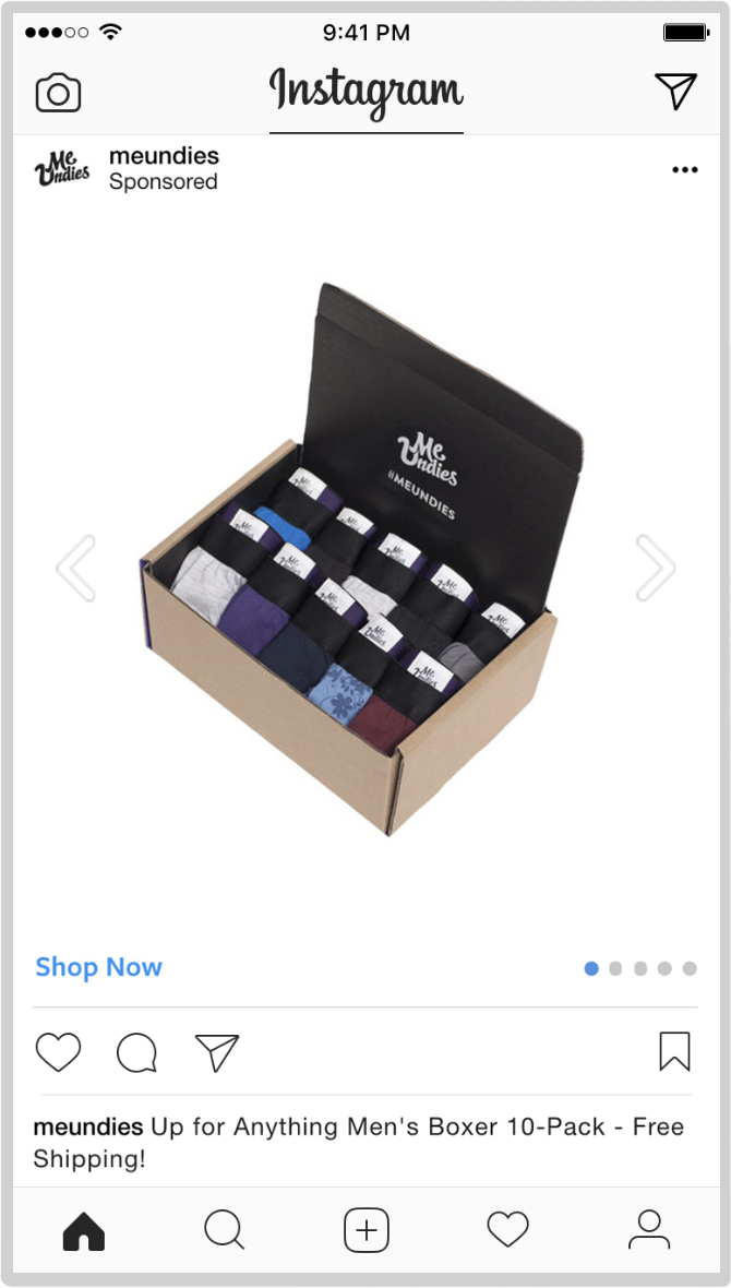 例如,零售商 MeUndies 在黑色星期五和網絡星期一的重定向廣告中使用了“立即購買”號召性用語按鈕。 該品牌建立了已經訪問過其網站的人的自定義受眾; 目標是激勵他們繼續購物並完成訂單。