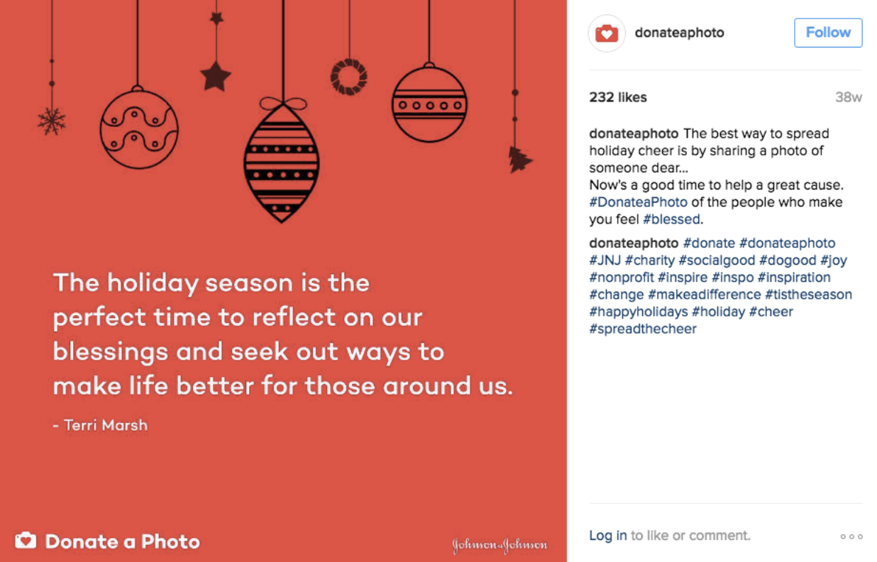 您還可以通過分享您的品牌如何與慈善機構和特殊事業合作來傳播節日歡樂。 例如,強生公司推出了一個照片廣告,邀請觀眾為慈善事業“捐贈一張照片”,並善用這些相冊。